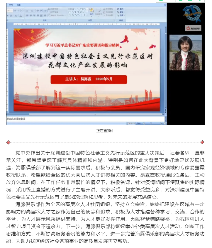 【本网讯】5月中旬,学院副院长易露霞应邀到花都海豚俱乐部讲学,主讲主题为《深圳建设中国特色社会主义先行示范区对花都文化产业发展的影响》是花都人社局下属的高层次人才交流机构。