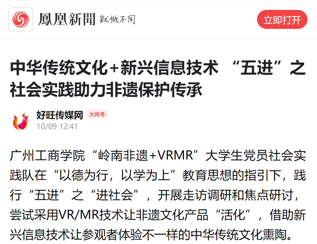 社会实践队师生代表参与了教育部“北创助教”产学研项目《产教融合:MR发展与在高校“德学”教育上应用研究》和中华职教社的《岭南非遗人才培养项目模式创新与实践研究》(ZJS-FY-009)等项目,得到相关专家、老师和VRMR标杆企业上海影创、遂光科技等的大力支持。