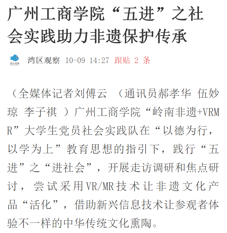 社会实践队师生代表参与了教育部“北创助教”产学研项目《产教融合:MR发展与在高校“德学”教育上应用研究》和中华职教社的《岭南非遗人才培养项目模式创新与实践研究》(ZJS-FY-009)等项目,得到相关专家、老师和VRMR标杆企业上海影创、遂光科技等的大力支持。