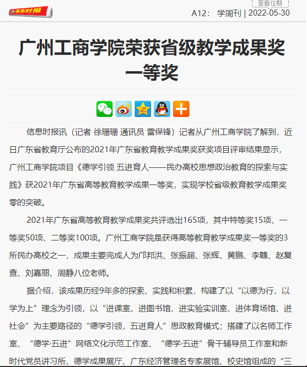 【羊城晚报】实现零的突破,广工商获省级教学成果奖一等奖