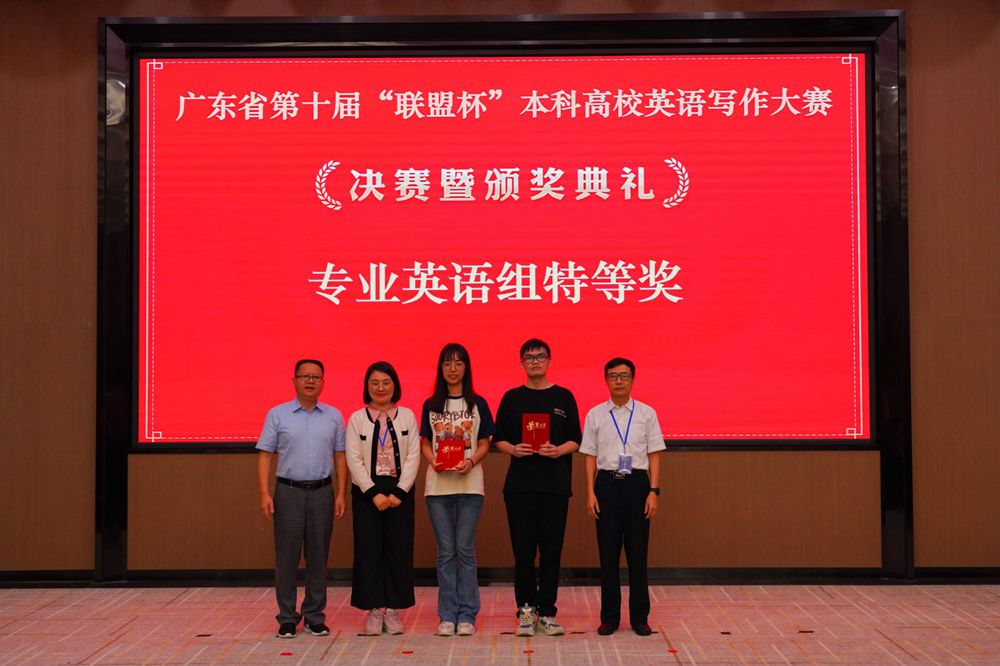 当天下午,广东省第十届“联盟杯”本科高校英语写作大赛决赛颁奖典礼在beat365在线体育官网登录入口图书馆举行,全体嘉宾和评委为大学英语组、英语专业组特等奖和一、二、三等奖的获奖者颁发了奖状,并表示祝贺。