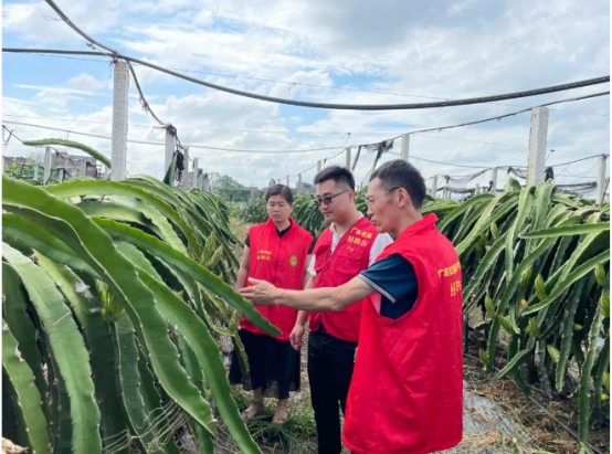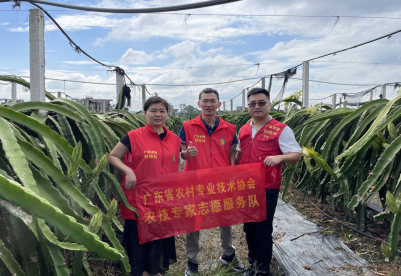 在罗定市新马龙农产品专业合作社的火龙果种植区的田间地头,团队针对火龙果的生长情况、田间管理(施肥、灌溉、防病虫害)及产品市场营销等进行了调研并结合存在的问题给予相应的科普与技术指导。
