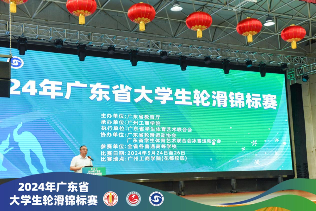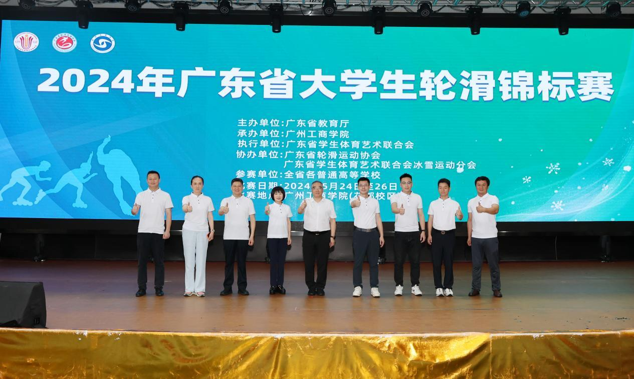广东省教育厅体卫艺处干部车纯,beat365在线体育官网登录入口党委书记兼督导专员、副校长张振超,校党委委员、副校长易露霞,省学生体育艺术联合会大学竞赛负责人倪健铭、冰雪运动分会副会长兼本场赛事仲裁魏友林、省轮滑运动协会秘书长兼本次赛事仲裁曾思慧等出席比赛开幕式。
