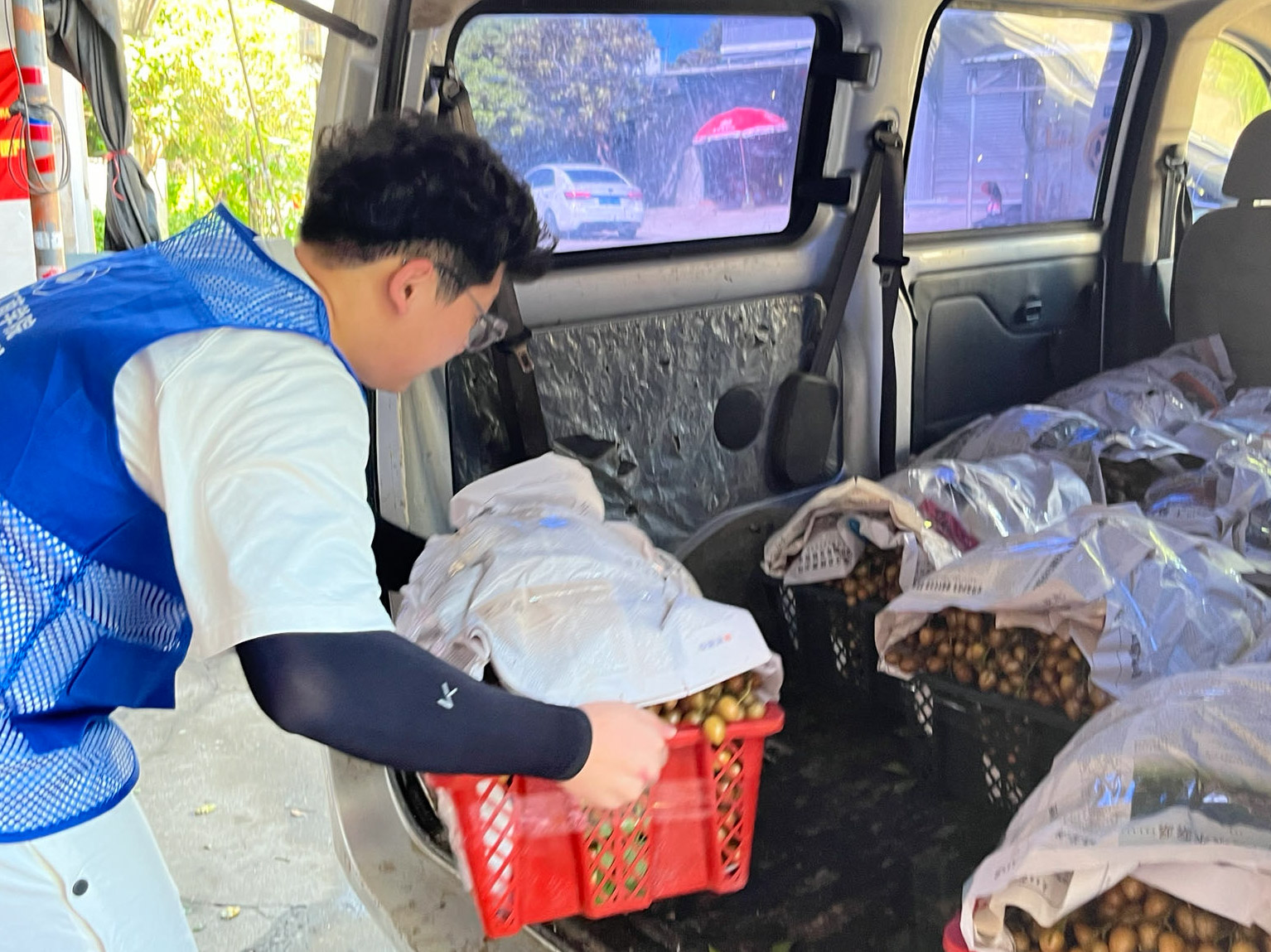 7月10日,突击队在李淼副书记和文祠镇中通快递李总等人的带领下,走访调研了当地的黄皮种植园。队员们细心地发现,每一束黄皮都被一层塑料袋包裹着,经过果农们的解说后队员们才恍然大悟,原来这是为了防止害虫侵袭,降低黄皮的产量损耗。此外,果农们坚决地说到果园中的黄皮始终坚持绿色种植,全程未施农药。经过果农的细心介绍,队员们对黄皮的种植、加工、销售以及加工方式有了更直观的了解。