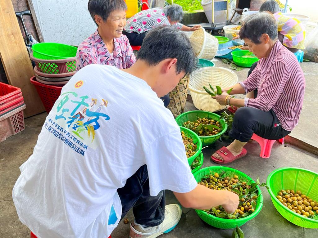 聚焦乡村振兴,果园调研寻奥秘。7月9日,突击队前往文祠镇西社村党群服务中心,与当地村委干部进行沟通交流,初步了解文祠镇当地的水果种植、运输、销售以及加工方式等情况。随后,在李淼副书记等的陪同下,队员们实地走访了当地街边“门店”黄皮收购商。队员们与热情好客的村民相谈甚欢,还亲身参与到黄皮的分拣、搬运等劳作中,近距离地感受黄皮的魅力。
