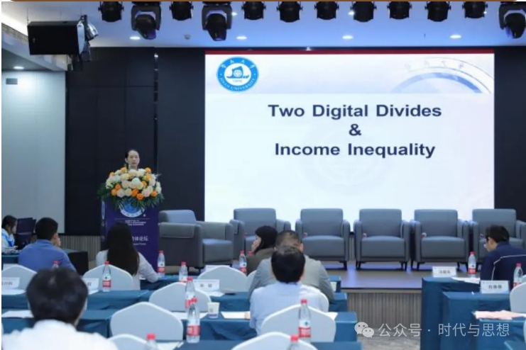 暨南大学经济学院副教授张珺发表“两个数字鸿沟和收入不平等”演讲。她指出全球国家的收入不平等在缩小而国家内的收入不平等在扩大。全球互联网覆盖率增长了超40%,数字化已成为全球经济增长不可或缺的因素。她深入研讨数字经济,发现数字经济发展的同时收入差距在减少。她还提出政策制定者应该先对本国经济发展做出评估再制定政策。