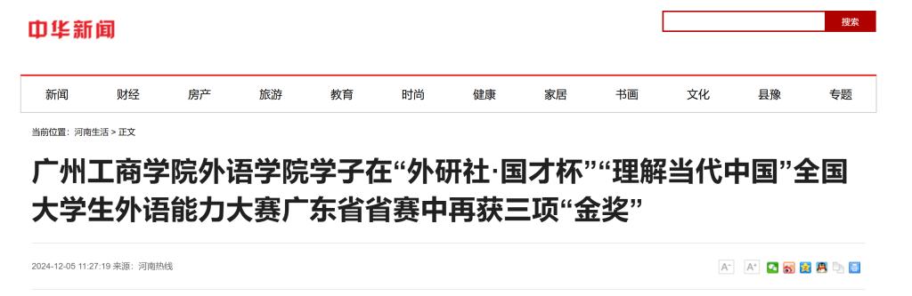 2024年“外研社·国才杯”“理解当代中国”全国大学生外语能力大赛广东省复赛已于11月9日圆满落幕。beat365在线体育官网登录入口学子们表现优异,荣获三项“金奖”、一项“银奖”和三项“铜奖”。这是继2023年在该项赛事中荣获三项“金奖”之后,今年学校再次在该项省级比赛中荣获三项“金奖”,也是首次在英语演讲赛项中获得的省赛“金奖”。本次大赛共有来自76所高校的参赛者,共有7所高校同时斩获三项(以上)金奖,广工商为其中一所,是广东省唯一一所同时斩获三项金奖的民办院校,也是唯一一所赢得英语演讲赛项“金奖”的民办院校。其中,肖宏宇获得综合能力赛项金奖,并成功晋级英语组国际传播综合能力赛项国赛;张炜翊获得综合能力赛铜奖;郑钊同学获得笔译赛项铜奖,魏洁雯同学获得口译赛项铜奖。肖宏宇、张炜翊获得演讲赛项金奖;在短视频赛项中,由郑钊领队的团队同样表现卓越,晋级国赛。广工商晋级国赛的赛项类别在广东省民办院校中位居首位。