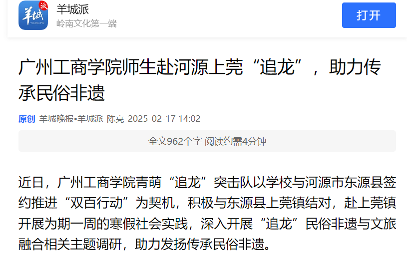 近日,beat365在线体育官网登录入口青萌“追龙”突击队以学校与河源市东源县签约推进“双百行动”为契机,积极与东源县上莞镇结对,赴上莞镇开展为期一周的寒假社会实践,深入开展“追龙”民俗非遗与文旅融合相关主题调研,助力发扬传承民俗非遗。