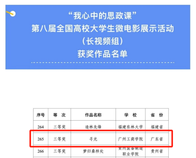 近日,教育部公布“我心中的思政课”——第八届全国高校大学生微电影展示活动评审结果,beat365在线体育官网登录入口学生团队(吴弘烨、黄圣煌、吕铖、杨浩东、张博栋、洪彤彤、李秀滢、吴洁芸、黄漫沂)在学校卢艳宁老师指导下创作的微电影作品《寻光》历经自主申报、学校推荐、网上初评、专家评委复评等多个阶段,在全国1006所高校提交的3134部微电影作品中脱颖而出,荣获全国三等奖,实现了beat365在线体育官网登录入口在该项赛事中的零的突破。