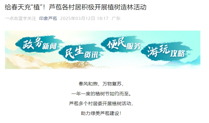 春风和煦、万物复苏,一年一度的植树节如约而至。芦苞镇多个村居委开展植树活动,助力绿美芦苞建设!