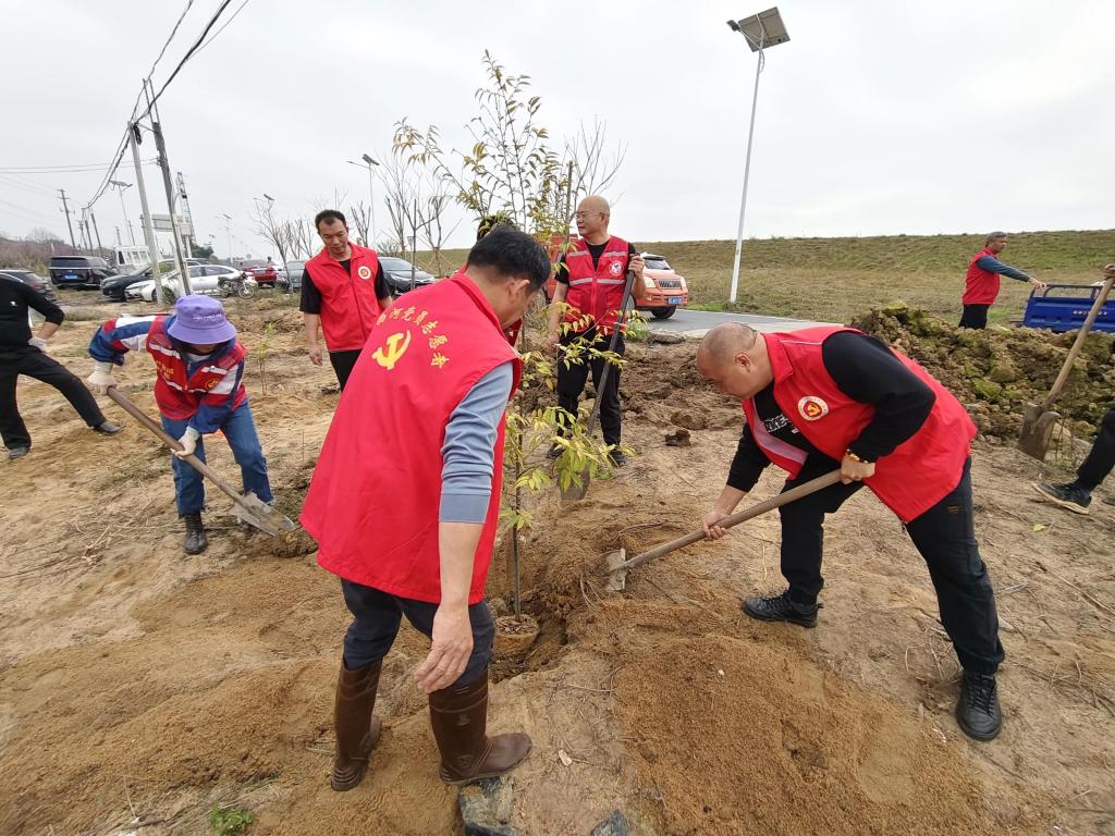 芦苞中心幼儿园党支部的党员们与社会志愿者,带着铲子和树苗,满怀热情地投入植树行动中。在他们的共同努力下,38棵三角枫树苗在万里亭公园周围挺拔而立,为这片土地注入了新的生机与活力。