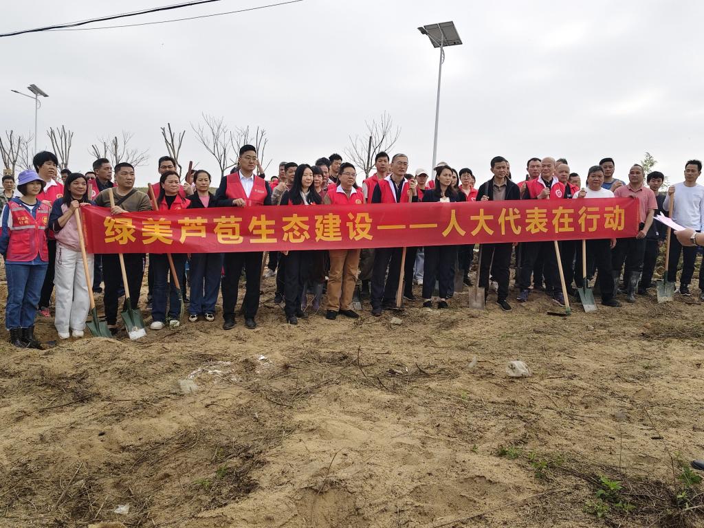 植树活动现场,人大代表们三五成组、分工协作,挥锄铲土、搬苗扶苗、踩实浇水,确保栽一棵活一棵,植一片绿一方。经过一番辛勤劳动,一排排新栽的树苗迎风挺立,在明媚的春光中展现出勃勃生机,增添了新的绿意。
