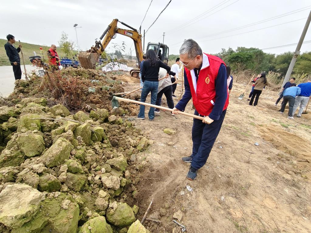 在同树涌区域,广工商的学生们与领越医院的医护人员携手合作,共同投入植树造林的事业中。他们分工明确,有的挖坑、有的扶树、有的浇水,每一个环节都井然有序。在他们的辛勤劳动下,150棵山杜英树木在同树涌区域傲然挺立,为独树岗村披上了一层绿色的外衣。
