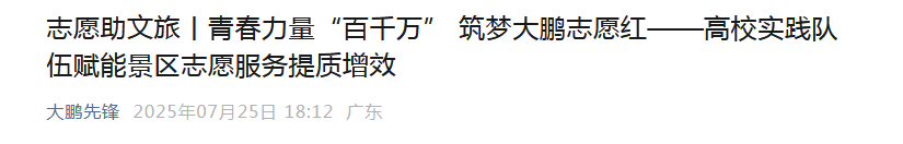 未来,大鹏团工委将以此次合作为样板,依托“百千万校地通”平台,持续拓展合作高校资源,吸引和汇聚更多有理想、敢担当、能吃苦、肯奋斗的青年实践队伍加入大鹏文旅志愿服务事业,共同书写城校共融、青春建功大鹏文旅高质量发展的崭新篇章!