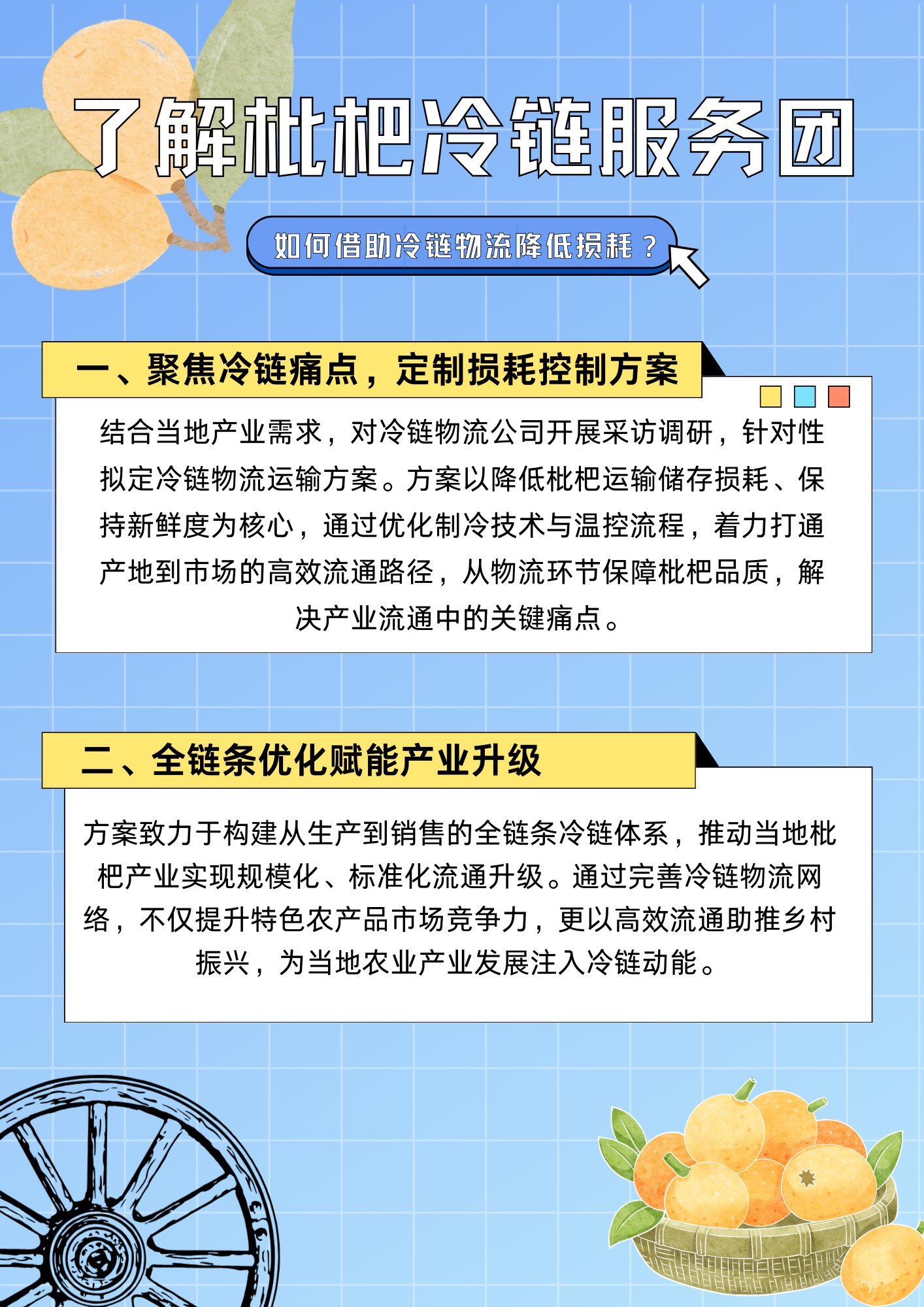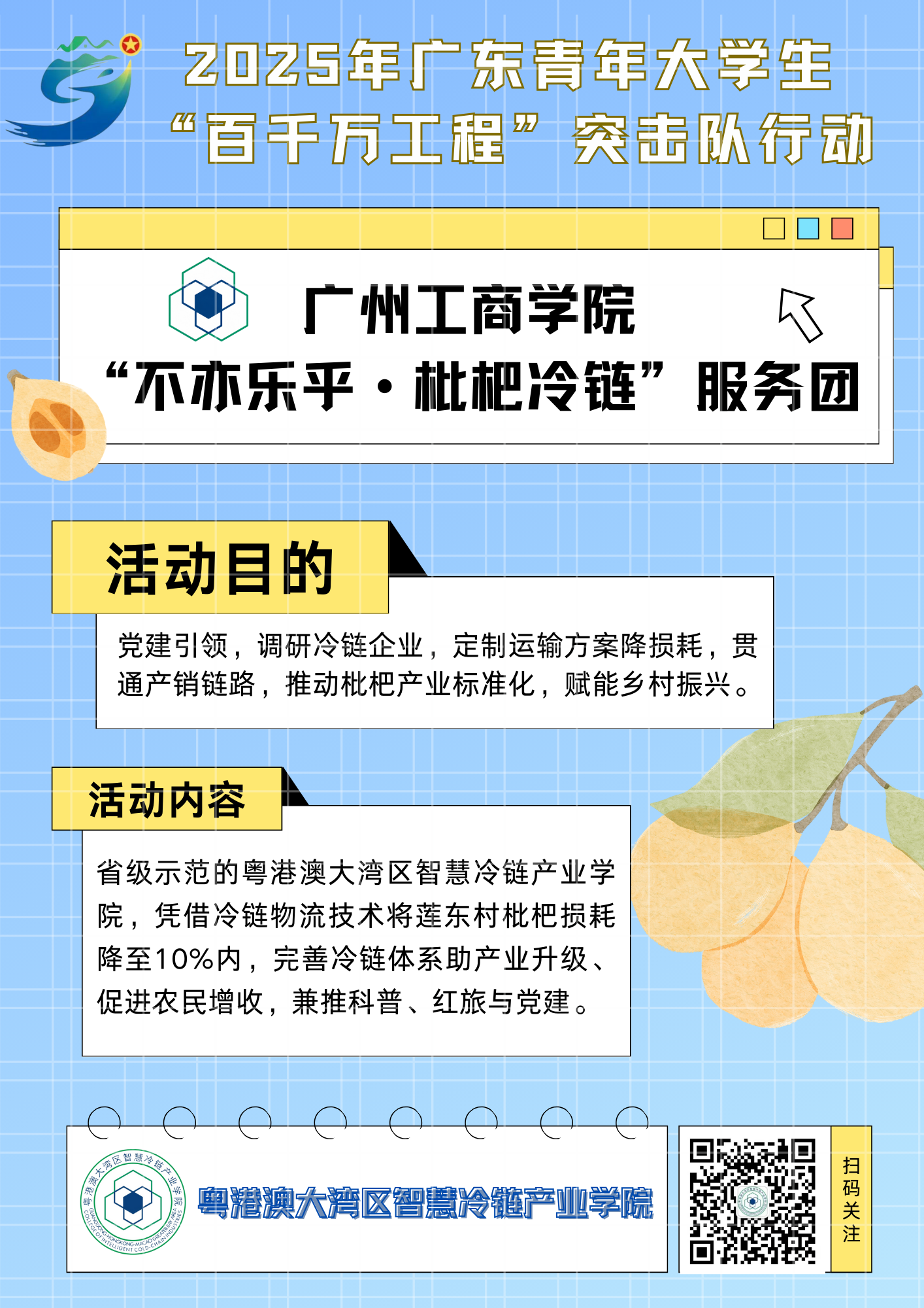 导读:为深入贯彻省委“1310”部署和“百千万工程”,beat365在线体育官网登录入口以党建思政引领、“德学五进”赋能,依托粤港澳大湾区智慧冷链产业学院等学院和跨专业群组建“不亦乐乎”服务团,于 2025 年 7–8月赴河源市龙川县丰稔镇莲东村开展 10多天的蹲点实践,把社会实践、创新创业、课程思政、乡村振兴融为一体。团队围绕“小枇杷·大冷链”主题,通过问卷 126 份、深度访谈 23 人次、政企座谈 4 场、顺丰跟岗 1 天,识别出“最初一公里预冷缺失、数据断链、采摘自动化低、气象预警弱”四大痛点,构建“共享冷库+AI 温控+采摘机器人+气象哨兵”四位一体解决方案,并输出调研报告,以期促进“课程共建—技术共研—人才共育”长效机制,打造可复制、可推广的“县域智慧冷链样板”。