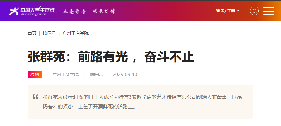 《内在动机》中写道:“真正的自由需要在主动改变环境和尊重环境之间取得平衡。心理上的自由需要一种接纳他人的态度。”张群苑大一开始兼职,大二投身创业,保持着屡败屡战的韧性,直至成功。她从60元日薪的打工人成长为持有3家教学点的艺术传播有限公司创始人兼董事。立足于星耀艺术中心的客户群体特征,她将自己的创业版图横向扩张,于2023年年初创办筱曼家政有限公司。一路走来,她自主勇敢、乐观坚强,迎光而上,以昂扬奋斗的姿态,走在了开满鲜花的道路上。