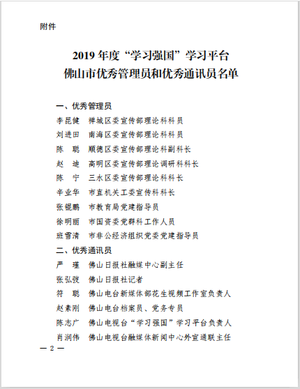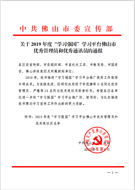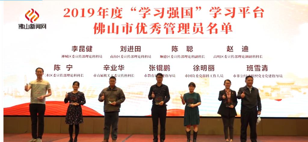 2019年,佛山在“学习强国”供稿总数、全国平台和广东学习平台采用稿件数等多项指标位居全省前列。为表彰先进,2020年4月10日中共佛山市委宣传部在佛山中欧中心举行佛山市推进“学习强国”学习平台推广使用工作分享会,广东省委宣传部副部长杜新山,佛山市委常委、宣传部部长郭长勇等领导出席活动。