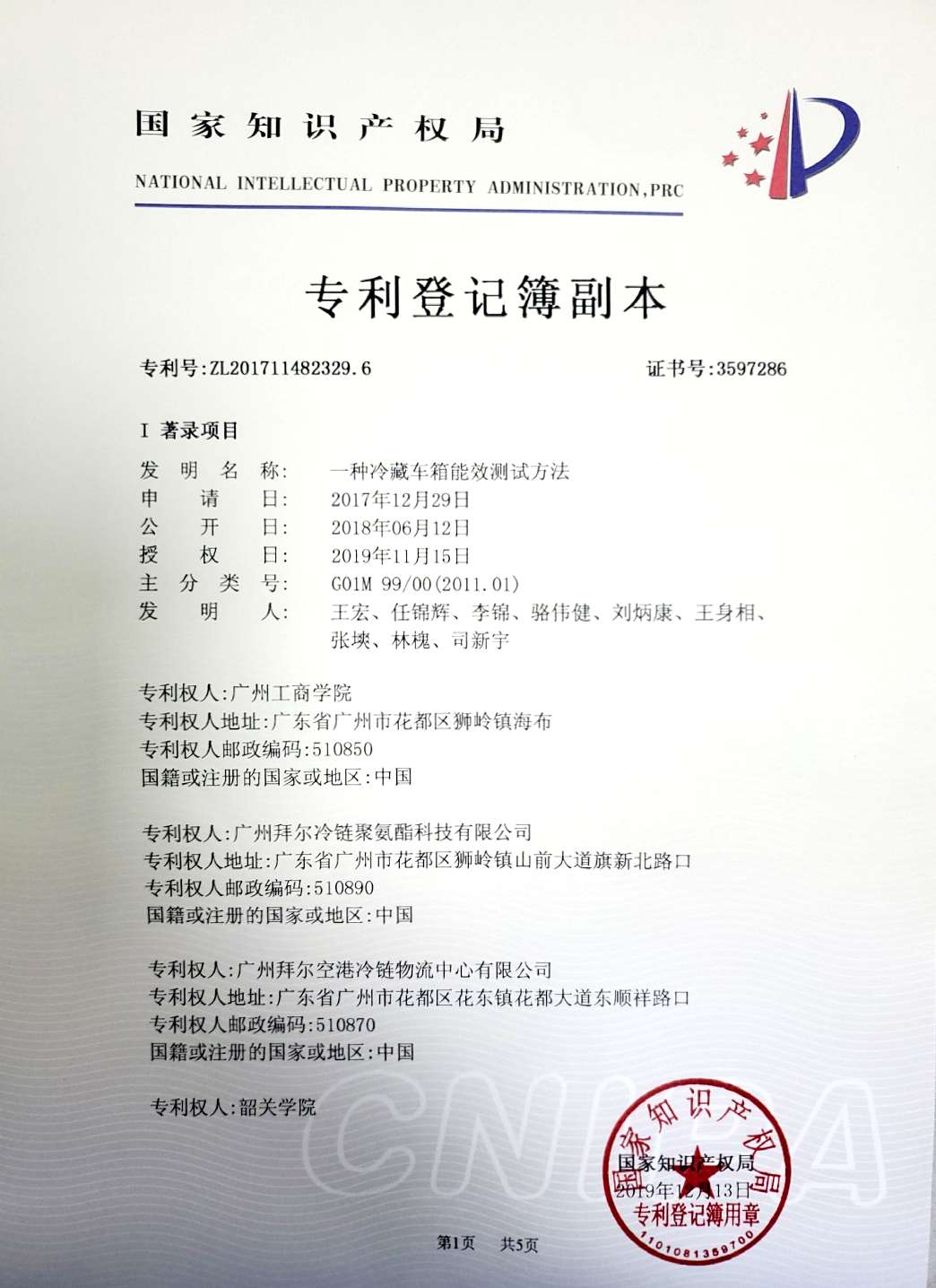 学院“一种冷藏车箱能效测试方法”获国家发明专利授权