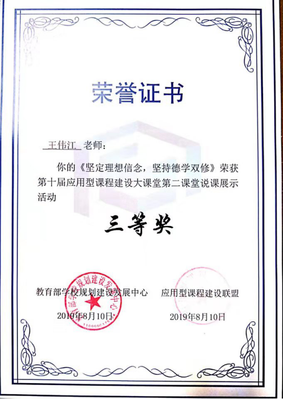 【本网讯】8月8-10日,由教育部学校规划建设发展中心、中国现代教育研修中心、应用型课程建设联盟主办的“第十期应用型课程建设大课堂”在国家教育行政学院举行。我院“德学教育课程化 五进活动内涵化”的探索实践得到业界专家肯定,其中,我院党委副书记、学生处处长黄鹏应主办方特邀作主题分享,工商管理系辅导员王伟江主讲的《坚定理想信念,坚持德学兼修》荣获第十届应用型课程建设大课堂第二课堂说课展示活动三等奖,该奖由教育部学校规划建设发展中心和应用型课程建设联盟颁发。
