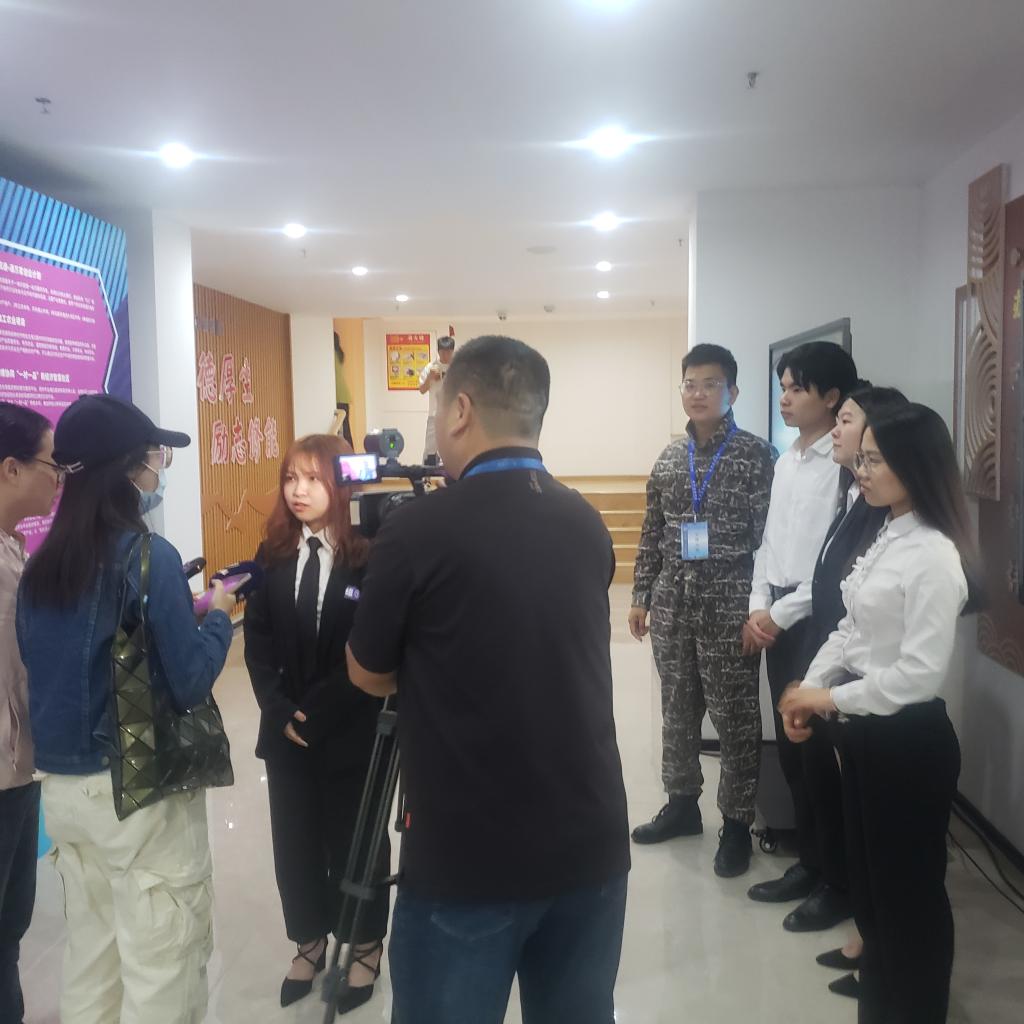 在决赛间隙,佛山三水电视台专门采访了“优鲜小分队--粤食部落”团队负责人赖姿璇及指导老师黄楚钦。该团队成员由经贸系和计算机系的同学组成。