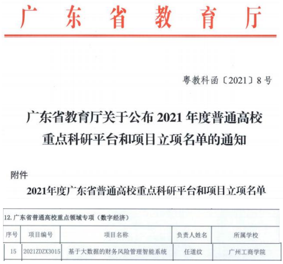 【本网讯】近日,广东省教育厅发布了《广东省教育厅关于公布2021年度普通高校重点科研平台和项目立项名单的通知》(粤教科函〔2021〕8号),beat365申报的《基于大数据的财务风险管理智能系统》获广东省普通高校重点领域专项(数字经济)立项,负责人为会计学院任道纹院长。这是beat365首次承担省重点领域专项。