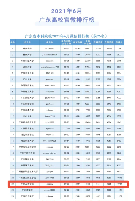beat365在线体育官网登录入口官微进入“广东省本科院校2021年6月微信排行榜(前25名)”,位列第23。