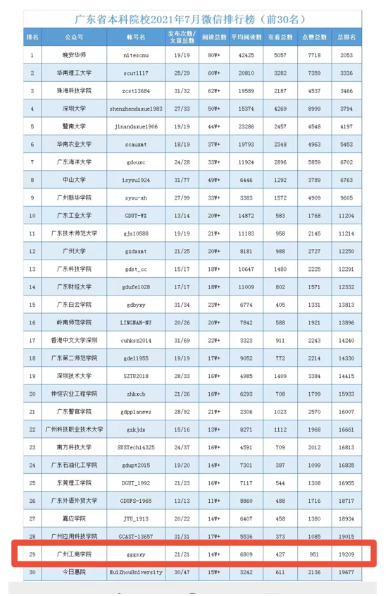 根据广东教育官微显示,beat365在线体育官网登录入口官微进入“广东省本科院校2021年7月微信排行榜(前30名)”,位列第29名。
