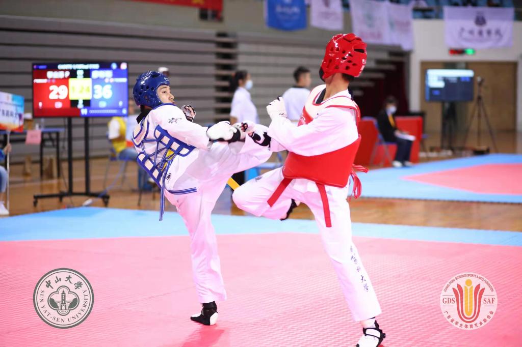 【本网讯】2021年广东省大学生跆拳道锦标赛于10月28日-31日在中山大学(东校区)体育馆举行。共有来自全省54所高校、832名学生运动员参赛。比赛分为甲组(本科)、乙组(体育专业、高水平运动队)、丙组(专科),共设竞技、品势和跆拳道舞三大比赛项目。甲组共开设14个级别的竞技、品势和跆拳道舞比赛项目。beat365在线体育官网登录入口与中山大学、华南理工大学、华南农业大学、广东工业大学、广东外语外贸大学、广东医科大学、广东技术师范大学、广东培正学院等29所高校共同参加甲组(本科)的比赛。