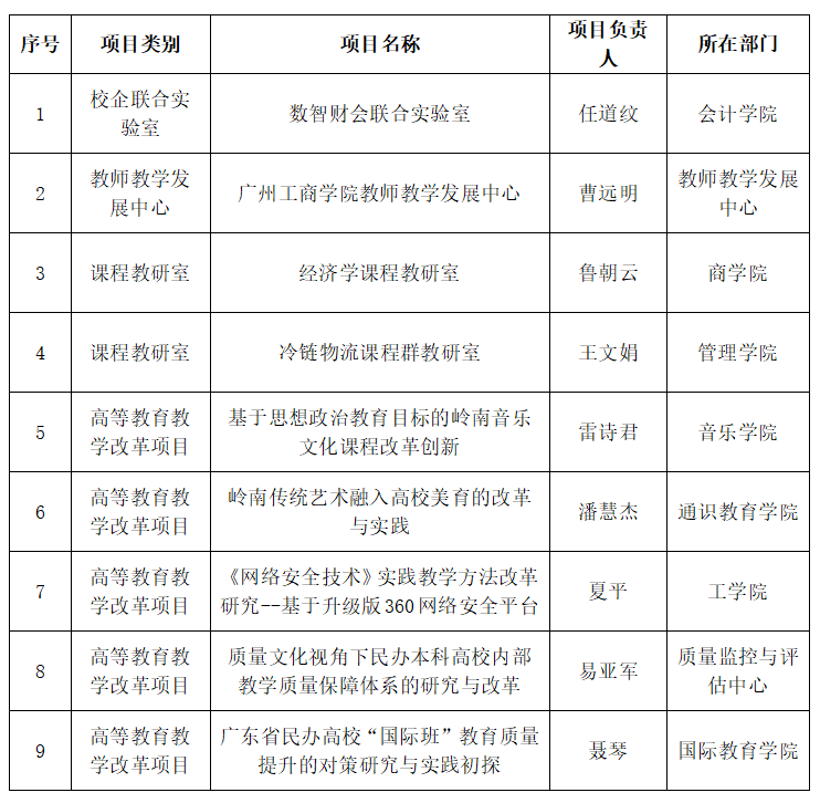 【本网讯】近日,广东省教育厅公布了《关于公布2021年广东省本科高校教学质量与教学改革工程建设项目立项名单的通知》(粤教高函〔2021〕29号),beat365申报的9个项目全部获批立项。其中校企联合实验室1项、教师教学发展中心1项、课程教研室2项、高等教育教学改革项目5项,为升本以来获批立项数之最,学校内涵建设成效显著提高。