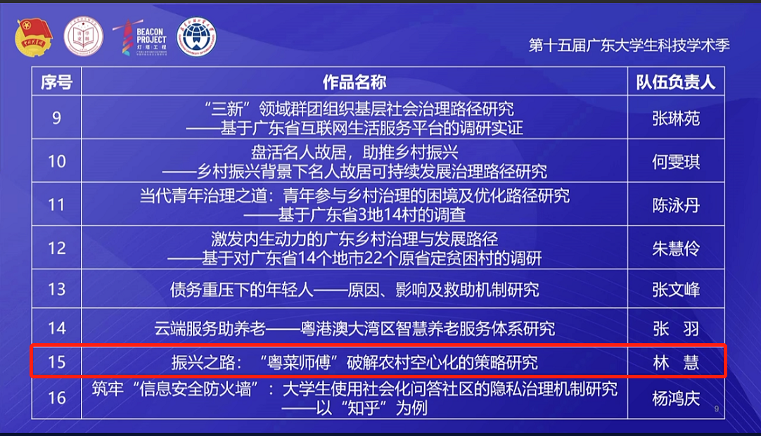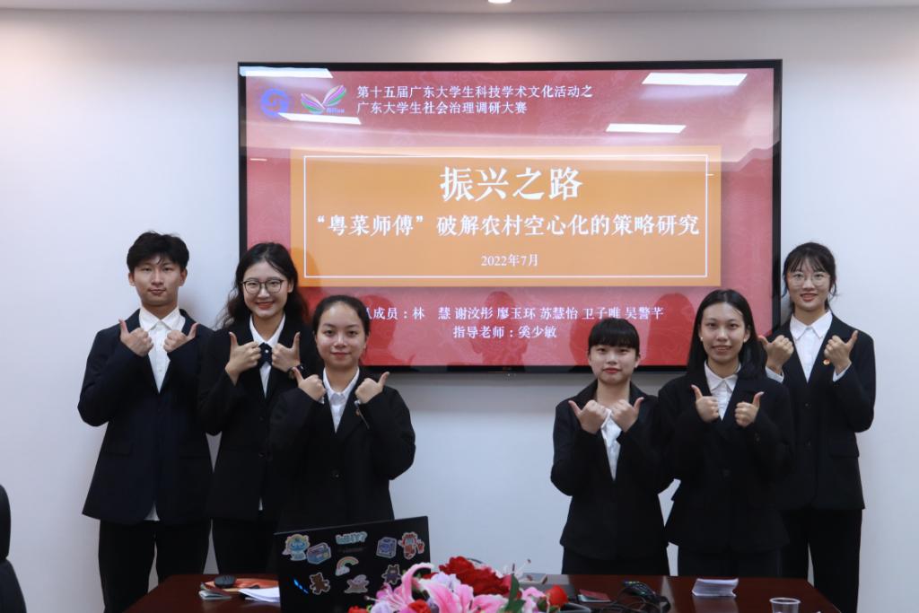 【本网讯】2022年7月3日,由共青团广东省委员会、广东省教育厅、广东省科学技术厅、广东省科学技术协会、广东省学生联合会等共同主办的广东大学生社会治理调研大赛在广东外语外贸大学闭幕,学校青萌公益《振兴之路:“粤菜师傅”破解农村空心化的策略研究》调研组斩获了大赛“特等奖”!