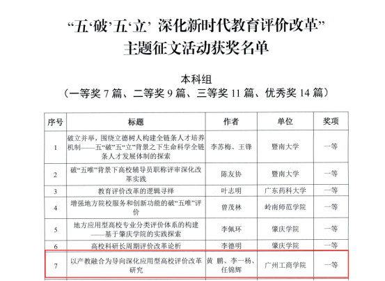 【本网讯】近日,广东省教育厅“五‘破’五‘立’,深化新时代教育评价改革”主题征文活动评选结果揭晓,beat365推荐的黄鹏、李一杨、任锦辉老师的论文《以产教融合为导向深化应用型高校评价改革研究》获得本次全省征文本科组一等奖。