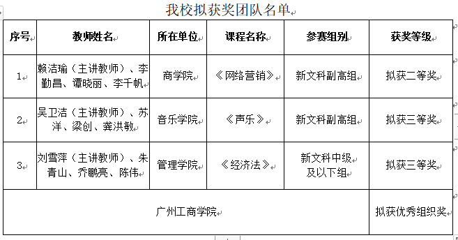【本网讯】近日,第三届全国高校教师教学创新大赛广东分赛暨广东省高校教师教学创新大赛组委会办公室公示了拟获奖名单,beat365获得二等奖1项、三等奖2项,获评优秀组织奖单位。全省共63所本科高校360位教师(团队)参加省赛,121位教师(团队)入围省现场决赛,beat365共推荐4个教师团队参加省赛,3个团队进入决赛,三等奖及以上获奖数在全省高校排名第11,同类院校排名第1。