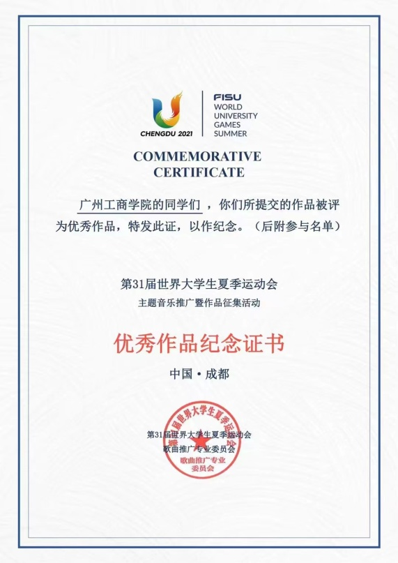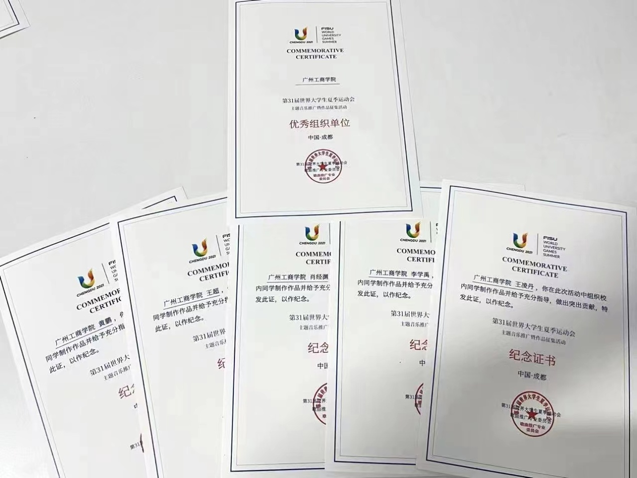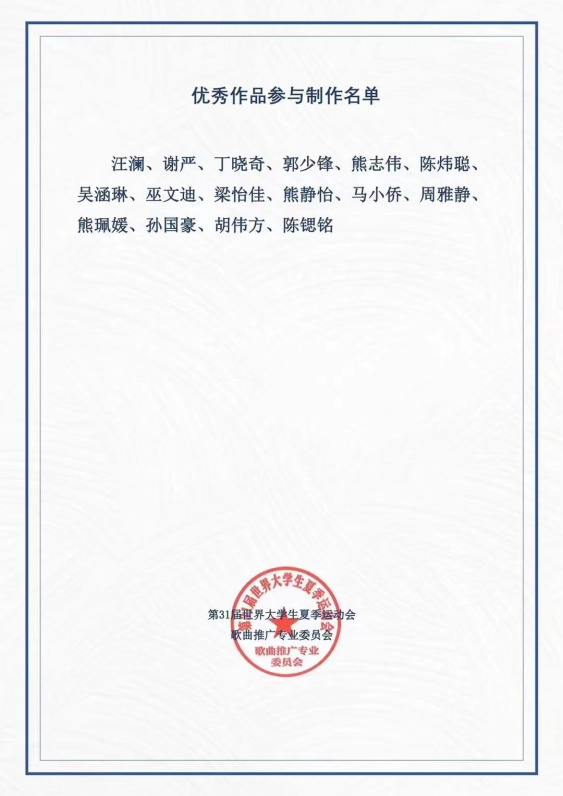 视频拍摄得到团中央全国学校共青团研究中心和第31届世界大学生夏季运动会歌曲推广专业委员会的指导。作品报送后,beat365在线体育官网登录入口荣获第31届世界大学生运动会主题音乐推广暨作品征集活动“优秀组织单位”,5位老师获“突出贡献奖”,美术学院、外语学院、商学院等16位学生获得优秀作品证书。