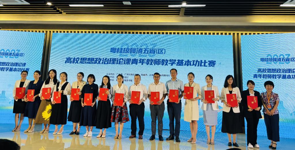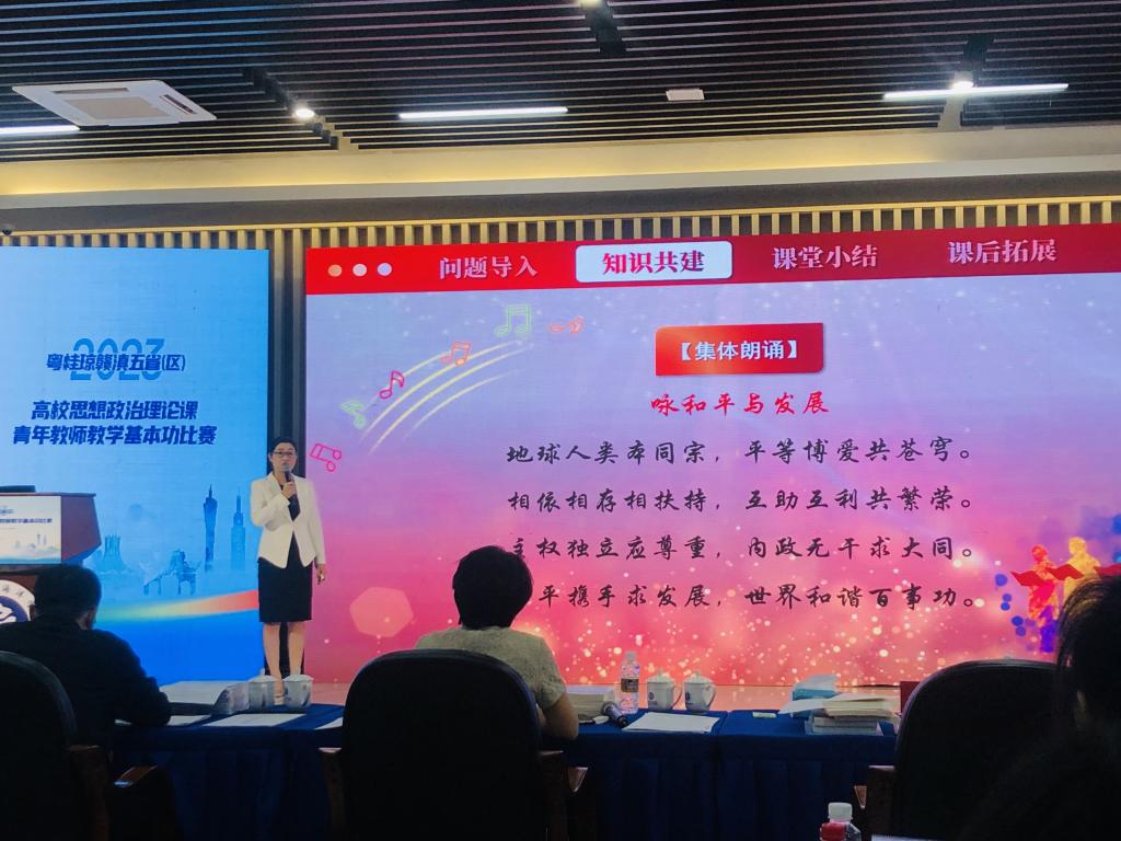 粤桂琼赣滇五省(区)高校思想政治理论课青年教师教学基本功比赛自2009年首次举办以来,已经成为粤桂琼赣滇五省(区)推进高校思政课建设的一大盛事,是提升青年教师教学能力的品牌赛事,对促进五省(区)高校思政课青年教师的成长有着促进作用。本次比赛通过教学设计、教学授课、专家提问三个环节,全方位展示了所授课程的教学设计、教学态度、教学内容和教学效果,是对参赛选手教学综合素质能力、教学基本功和现场答辩应变能力的综合考验。谭丽婷老师以扎实的理论水平与过硬的教学基本功,完成了《毛泽东思想和中国特色社会主义理论体系概论》课程第五章节选内容的教学展示,收获评委的好评。