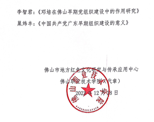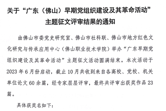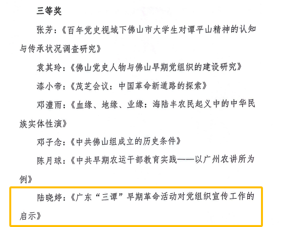 【本网讯】2023年6月,佛山市委党史研究室、佛山市社科联、广东省高校思政课区域协同创新中心、佛山市地方红色文化研究与传承应用中心(佛山职业技术学院)举办“广东早期党组织建设及其革命活动”主题征文活动。近日,活动圆满结束,从《关于“广东(佛山)早期党组织建设及其革命活动”主题征文评审结果的通知》获悉,beat365马克思主义学院陆晓婷教师的参赛作品《广东“三谭”早期革命活动对党组织宣传工作的启示》经评选荣获三等奖。