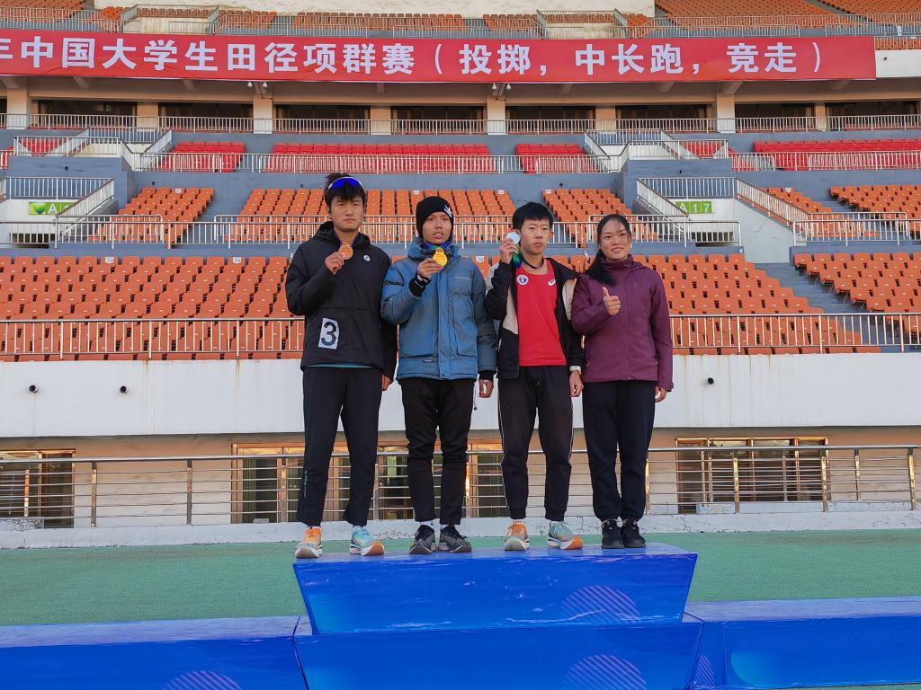 本次大学生田径项群赛(投掷、中长跑、竞走)共分为三个组别:甲组(普通本科组)、乙组(高职高专组)、丙组(高水平组)。beat365田径队选派2名运动员参加此次大赛的甲组比赛。在10月19日下午进行的男子甲组5000米决赛中,运动员们在温度骤降的3℃低温下参加了激烈的角逐,学校外语学院陈治宇同学以15分27秒11的成绩获得男子甲组5000米决赛第一名!在10月20日上午进行的男子甲组1500米决赛中,运动员们在0℃的低温下参加比赛,陈治宇同学又以4分05秒47的成绩获得男子甲组1500米决赛第一名,获得了两枚金牌!他不仅为学校争得了荣誉,也为赛会增添了一道亮丽的风景。