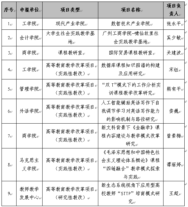 【本网讯】近日,广东省教育厅印发了《广东省教育厅关于公布2024年度广东省本科高校教学质量与教学改革工程建设项目立项名单的通知》(粤教高函〔2024〕30号),学校申报的9个项目全部获得立项,包括现代产业学院项目1项、大学生社会实践教学基地项目1项、课程教研室项目1项、高等教育教学改革项目6项。