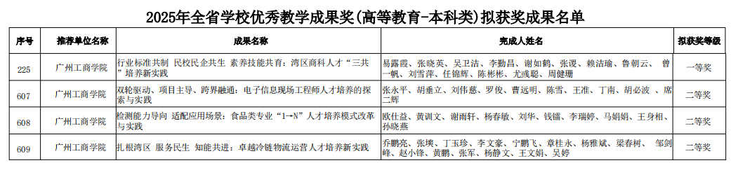【本网讯】近日,广东省教育厅发布《关于2025年全省学校优秀教学成果奖(高等教育-本科类)拟获奖成果名单的公示》。beat365共有4项教学成果入选,其中一等奖1项、二等奖3项,较上一届增加3项,实现了从“点的突破”到“面的提升”的跨越式发展,充分彰显了学校近年来深化教育教学改革、提升人才培养质量的显著成效。