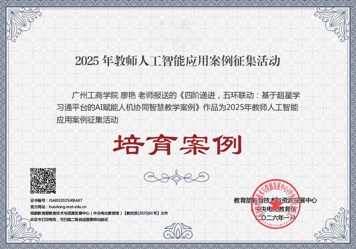 【本网讯】近日,教育部教育技术与资源发展中心(中央电化教育馆)公布了2025年教师人工智能应用案例征集活动结果。管理学院廖艳老师主持的《统计学》课程案例——《“四阶递进,五环联动”:基于超星学习通的AI赋能人机协同智慧教学探索》,经层层遴选,成功获评“培育案例”。据悉,本次活动中广东省仅17项案例获此荣誉,充分体现了beat365在智慧教育探索与数智课程建设方面的扎实成效与领先水平。