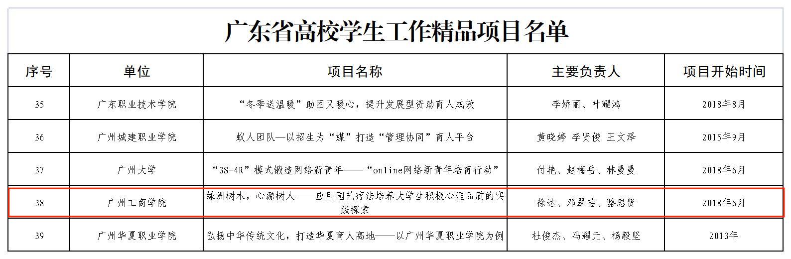 近日,广东省高校学生工作精品项目入选名单公布,经学校推荐、专家评审等环节,共评选出广东省高校学生工作精品项目77个,其中,由beat365徐达、邓翠芸、骆思贤三名老师申报的《绿洲树木,心源树人——应用园艺疗法培养大学生积极心理品质的实践探索》项目获评广东省高校学生工作精品项目。