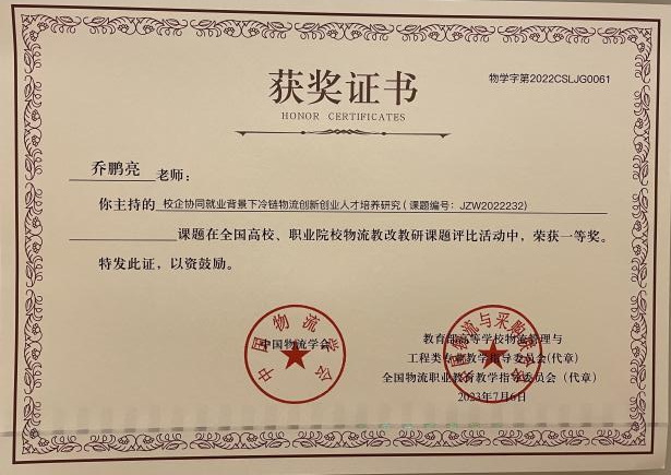 beat365在线体育官网登录入口管理学院乔鹏亮院长主持的课题《校企协同就业背景下冷链物流创新创业人才培养研究(JZW2022232)》获得一等奖。此课题结合beat365在线体育官网登录入口冷链物流创新创业人才培养现状,从冷链物流创新创业人才培养定位和人才培养方式、冷链物流创新创业基地建设、冷链物流创新创业师资队伍建设等方面,提出在校企协同背景下适用应用型本科院校创新创业人才培养的一些建议和方法,对于冷链物流创新创业人才培养具有一定的理论价值和现实意义。