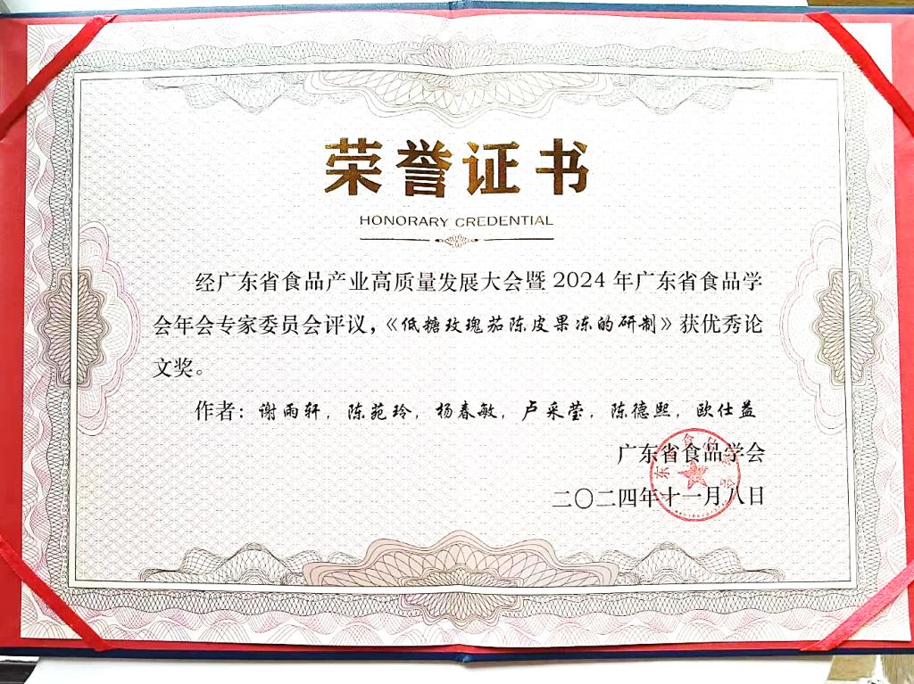 【本网讯】11月8日,广东省食品产业高质量发展大会暨2024年广东省食品学会年会在佛山大学举行。学会共评出优秀论文5篇,学校以谢雨轩老师为第一作者的论文《低糖玫瑰茄陈皮果冻的研制》荣获“2024年广东省食品学会年会优秀论文奖”。这是beat365首次在广东省食品学会年会上获得“优秀论文奖”。