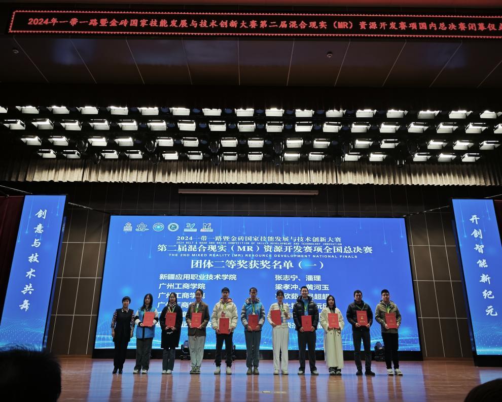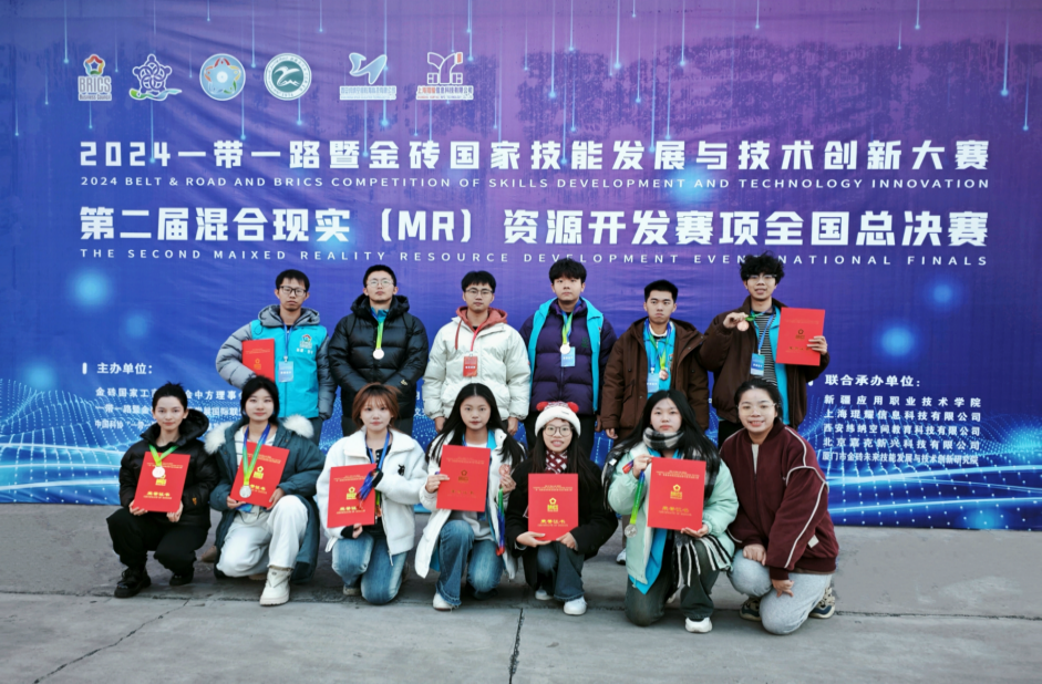 【本网讯】近日,备受瞩目的2024年“一带一路”暨金砖国家技能发展与技术创新大赛第二届混合现实(MR)资源开发赛项国内决赛圆满落幕,beat365在线体育官网登录入口参赛队伍在此次高水平的竞技舞台上取得了令人振奋的优异成绩:教师团队凭借卓越的专业技能与团队协作能力,成功斩获三项二等奖、一项三等奖的殊荣;学生团队也毫不逊色,以出色的创意与实践能力同样赢得了一项一等奖、一项二等奖、两项三等奖的佳绩;同时,学校还斩获最佳组织奖。