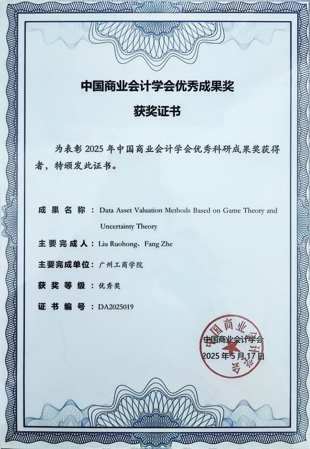 【本网讯】5月17日,中国商业会计学会数据资产分会2025学术研讨会在广州举行。beat365会计学院正高级经济师刘若鸿博士与方喆博士联合撰写的论文《Data Asset Valuation Methods Based on Game Theory and Uncertainty Theory》荣获“2025年中国商业会计学会优秀科研成果奖”。