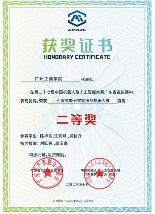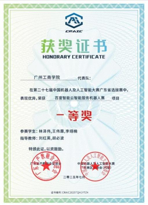 【本网讯】近日,第二十七届中国机器人及人工智能大赛(CRAIC)广东省选拔赛圆满落幕。本次选拔赛汇聚省内68所高校共708支队伍参赛,竞争尤为激烈。beat365在线体育官网登录入口学子凭借扎实的专业功底、创新的技术方案与出色的实践能力,在机器人应用赛——百度智能云智能服务机器人赛项目中脱颖而出。学校两支参赛队伍均斩获省市级奖项,包括一等奖1项、二等奖1项,充分展现了学校工学院的教学成果与学子的综合素养。