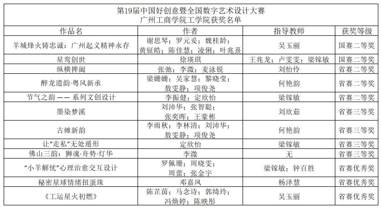 第19届中国好创意暨全国数字艺术设计大赛工学院获奖名单