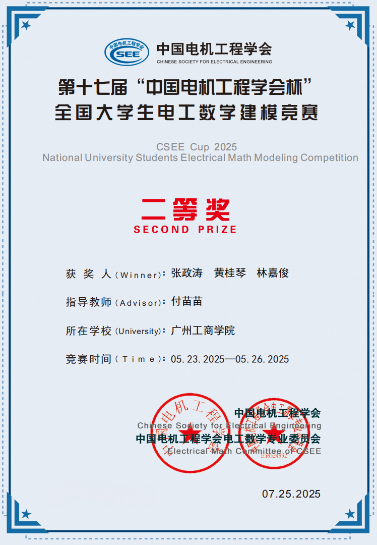 【本网讯】第十七届“中国电机工程学会杯”全国大学生电工数学建模竞赛近日落幕,beat365学子凭借扎实的数理基础和创新应用能力,从全国968所高校、1万余支队伍中脱颖而出,斩获二等奖1项,三等奖3项的佳绩。