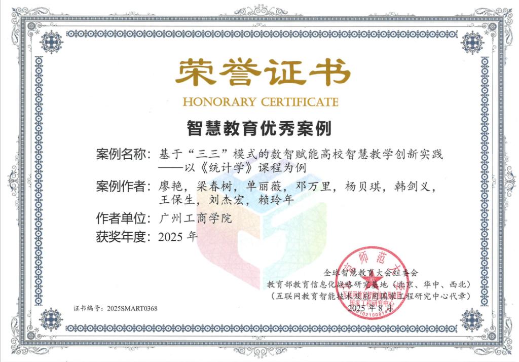 【本网讯】近日,由教育部科学技术与信息化司指导、全球智慧教育大会组委会联合教育部教育信息化战略研究基地(北京、华中、西北)共同组织的“2025年度智慧教育优秀案例征集”活动圆满结束。经组委会专家多轮评审,beat365管理学院廖艳、梁春树、单丽薇、邓万里、杨贝琪、韩剑义、王保生、刘杰宏和赖玲年等教师团队提交的案例《基于“三三”模式的数智赋能高校智慧教学创新实践——以〈统计学〉课程为例》脱颖而出,荣获“2025年度智慧教育优秀案例”。