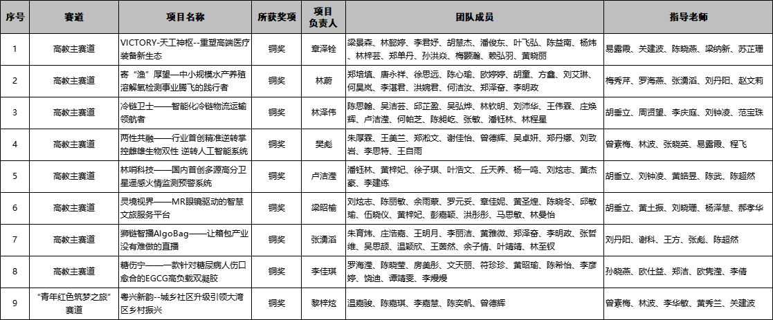 【本网讯】近日,广东省教育厅下发关于公布中国国际大学生创新大赛(2025)广东省分赛获奖名单的通知。beat365共获得铜奖9项(高教主赛道8项、“青年红色筑梦之旅”赛道1项)的优异成绩,创beat365该项赛事获奖总数的历史新高。