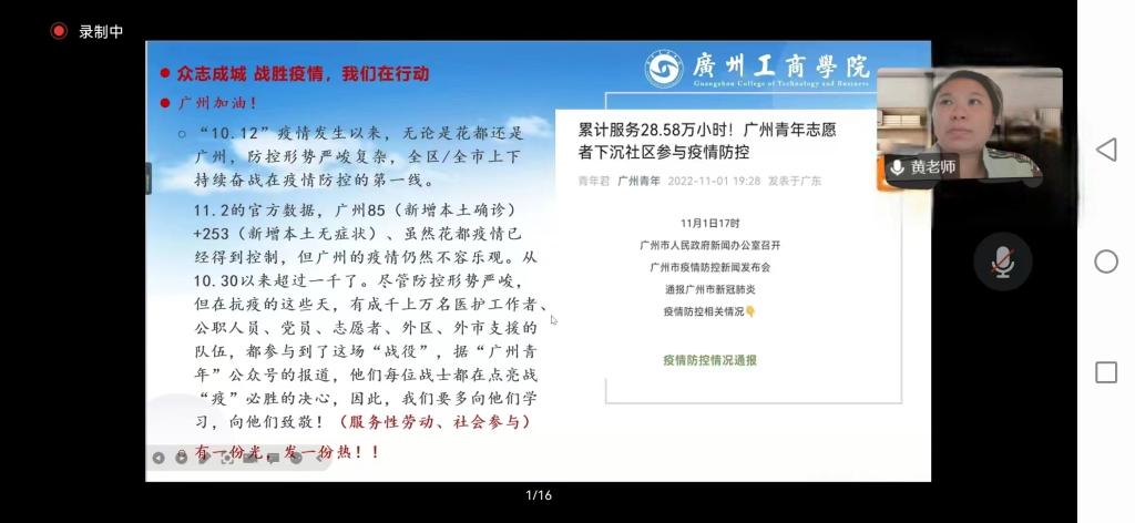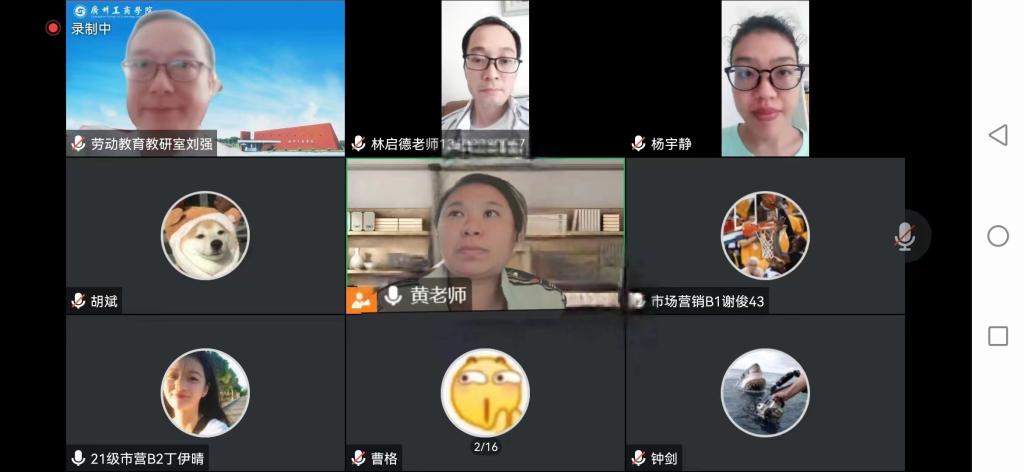 根据广工商院教发中心发〔2022〕18号《关于组织开展2022-2023学年第一学期教学观摩课活动的通知》文件精神,为加强教师之间的教学交流,促进广大教师更新教育理念、掌握现代教学方法手段、锤炼教学基本功,不断提升beat365的教学水平,全面落实立德树人根本任务,11月2日下午,腾讯会议线上包括劳动教育教研室的全体专任教师共118名师生、领导和专家参与了劳动教育教研室黄静瑜老师的观摩课,正式开启了学院教师观摩大赛的序幕。